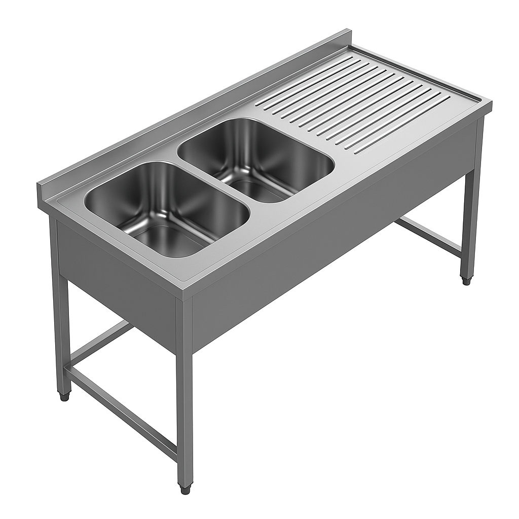 Çift evyeli demonte yıkama ünitesi, kolay montaj özelliği ve sağlam yapısıyla endüstriyel mutfaklarda sık tercih edilir.