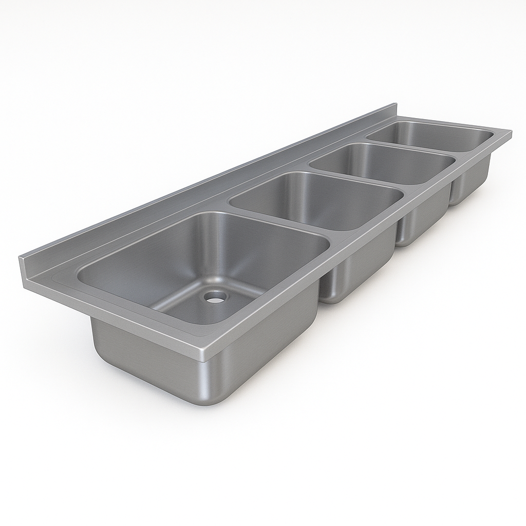 Dört gözlü damlalıksız evye, aynı anda birden fazla personelin çalışmasına olanak tanır. Yüksek kapasiteli mutfaklarda verimli ve düzenli kullanım sağlar.