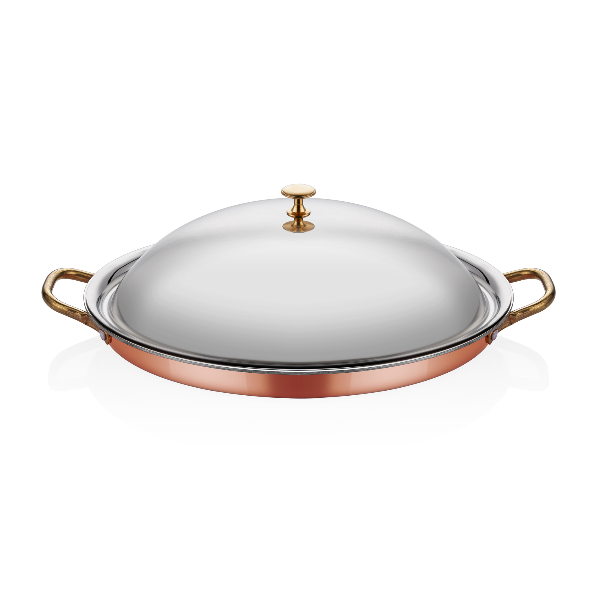Multi Metal Bakır Oval Sığ Sahan + Kapak, geniş yüzeyi ve kapağı ile çok yönlü pişirme imkânı sunar, estetik sunumlara olanak tanır.