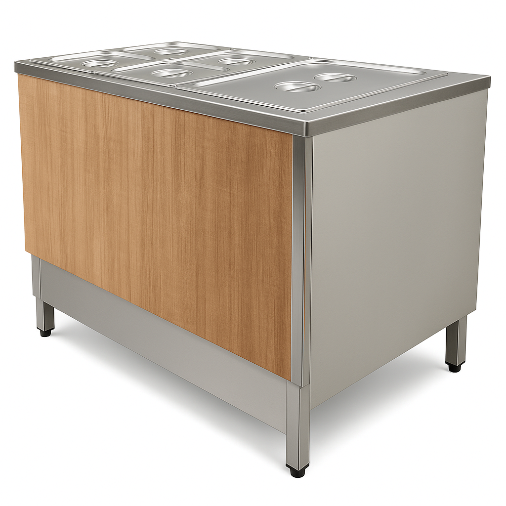Modern ve sağlam yapısıyla açık büfelerde sıcak-soğuk ürün sunumlarına uygun bir servis alanı oluºturur. [cite: 8] [cite_start]Alt bölmeler depolama için kullanılabilir.